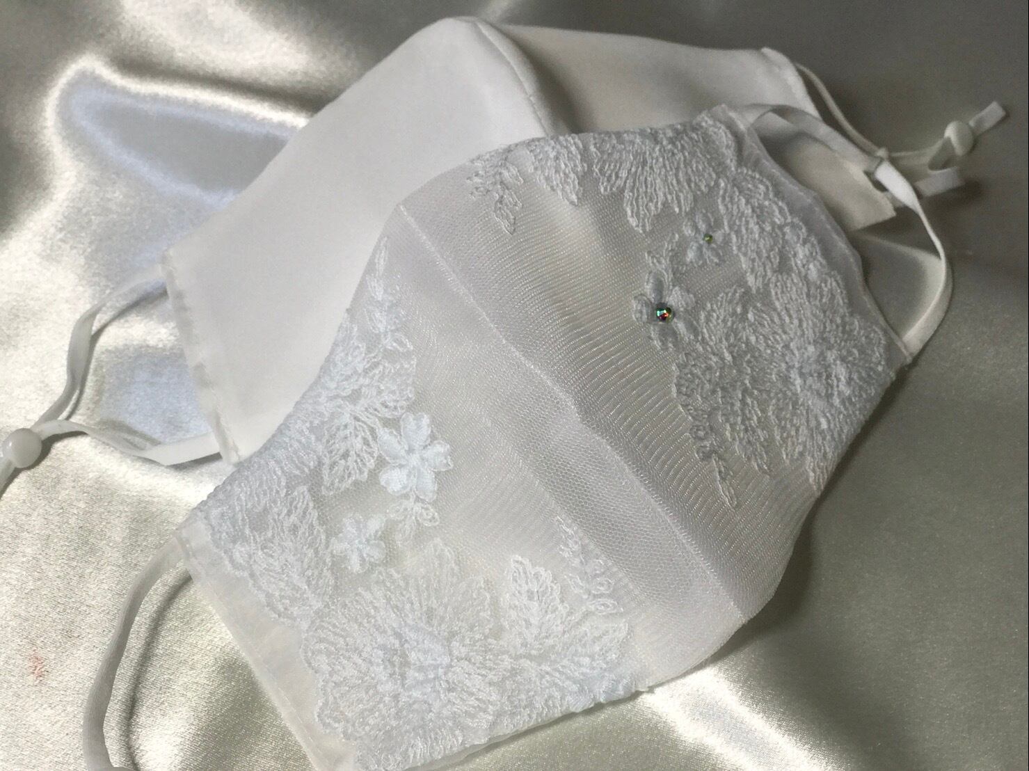 白いマスクはスタンダードですが、よく見ると気が付くおしゃれなレースやラメなど、さりげない個性のアピールができるお品かと思います。ホワイトの中で一番大きなラメと、少し濃い目のレース柄が個性を際立たせます。耳ひもは柔らかく長さ調整もできてユーザーさん想い。さらに作家さんからのお手紙までついて、まさに世界でたったひとつの価値あるマスクです。