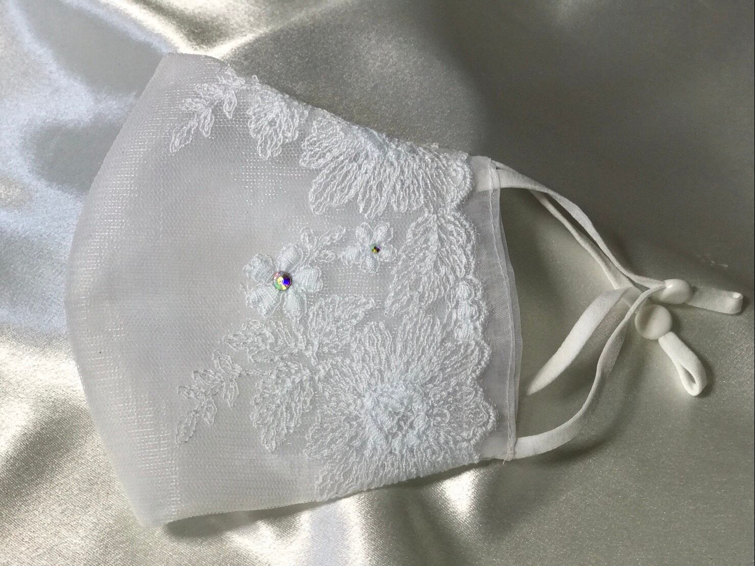 作家さんがレース生地から厳選した部分をカットして作った贅沢なデザインです。生地をカットする位置が微妙に異なるので、同色・同シリーズでも同じレース模様がありません。さりげないラメが上品さを更にワンランクアップさせています。薄手の透ける素材ですが、ベースマスクがあるので問題ありません。色は真白です。