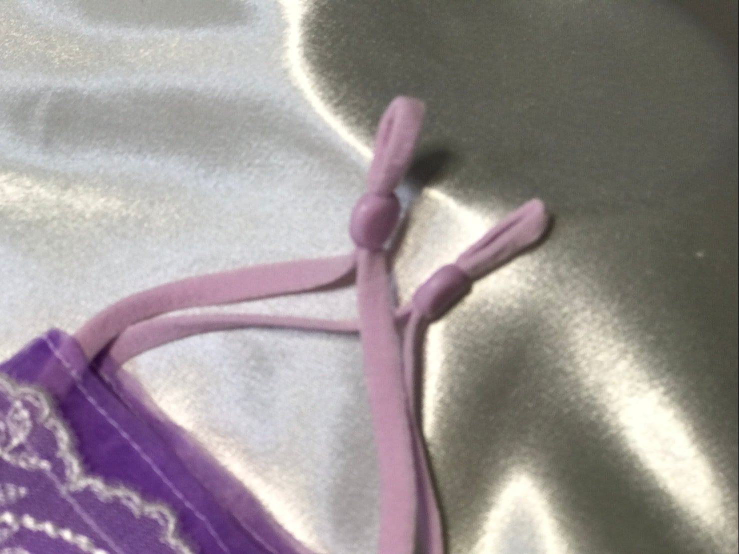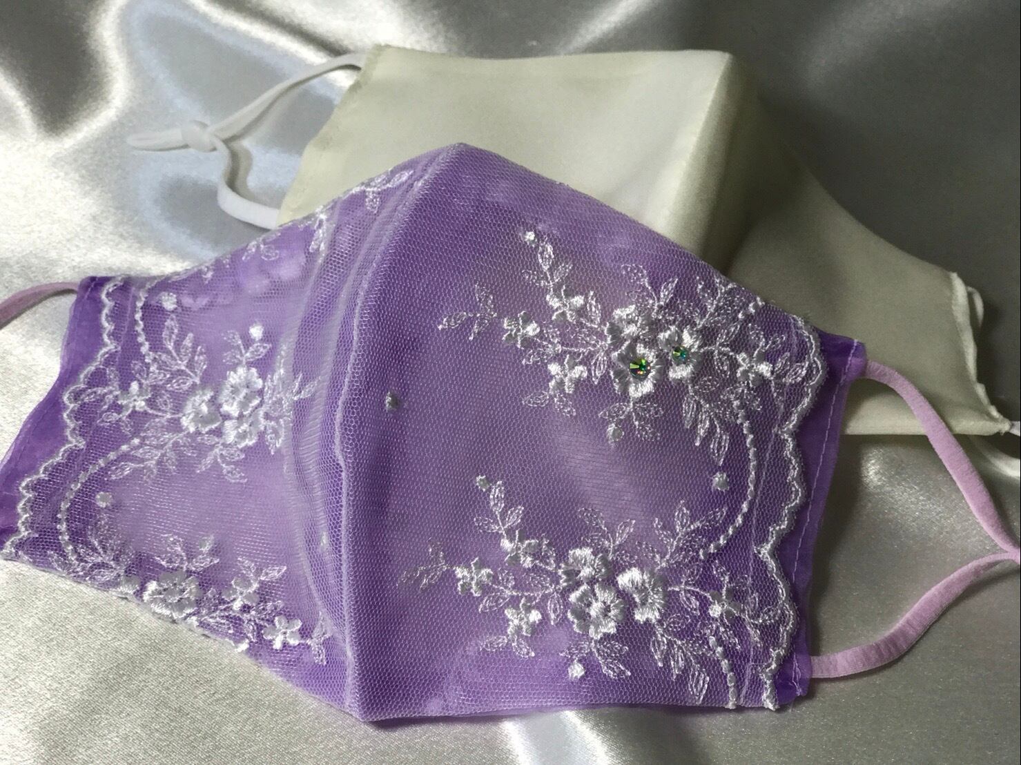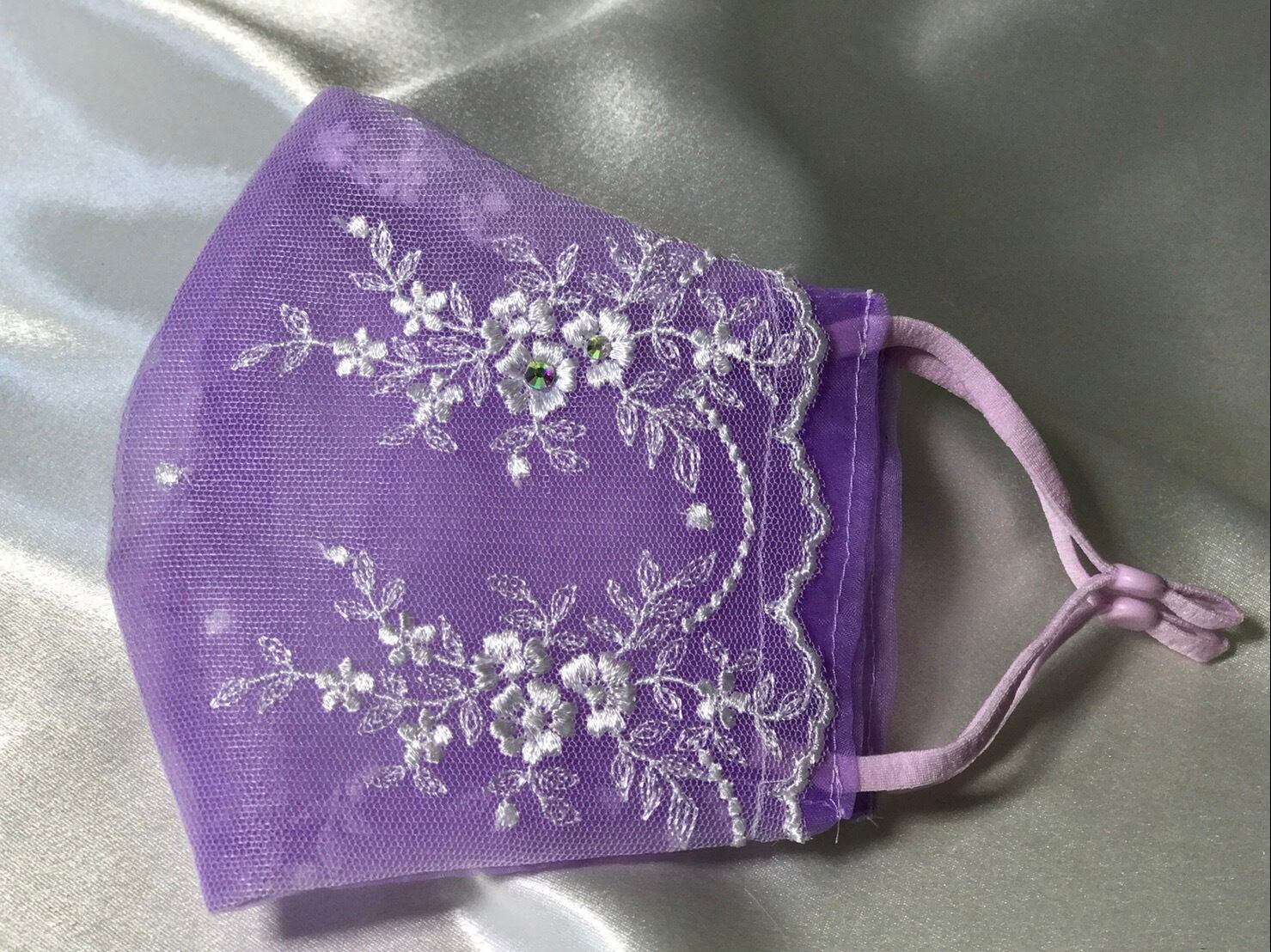 作家さんが厳選した生地から選ばれた部分をカットして作った贅沢なデザインです。生地をカットする位置が微妙に異なるので、同色の同じシリーズでも同じレース模様がありません。さりげないラメが上品さを更にワンランクアップさせています。色はカバーマスクの生地は少し薄めの紫ですが、レース生地は真白です。粗めの網目生地なので、下地の紫を少し和らげた雰囲気になっています。(実際の商品は写真よりも少し淡い印象です)