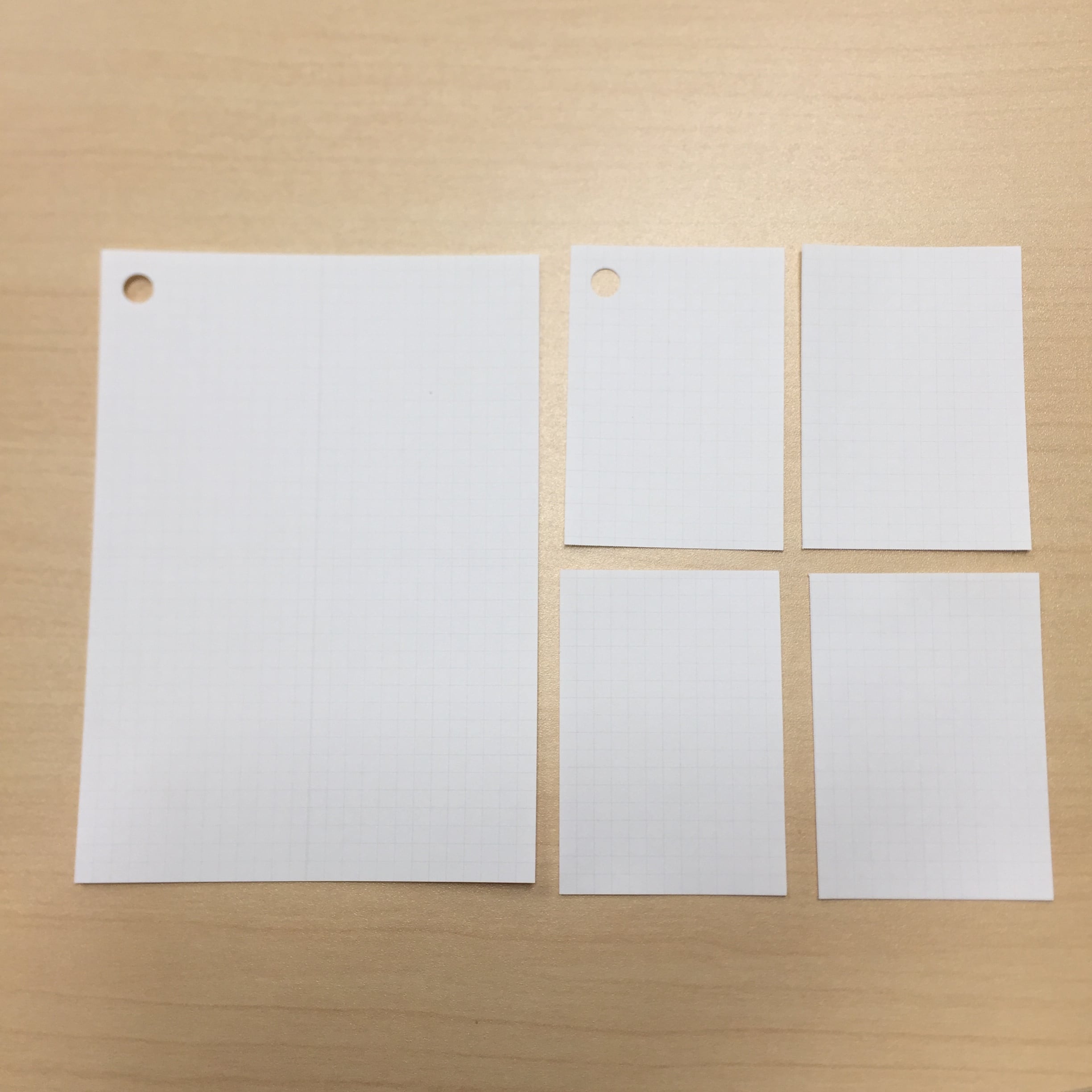 よんぶんのいちメモシリーズのシンプルなモデル、A6方眼です。カバンの中でも引っかからない様にリングを廃止し、サイズは規格に沿ってA6にしました。シリーズを通じて同じ超マイクロミシン目を採用し、ミシン目をまたいで筆記しても抵抗感がなく、ちぎってもちぎらなくても自由にお使いいただけます。方眼はスタンダードな4mmで、コピー機にも写らない絶妙な濃さに設定してあります。フック穴もぜひ活用していただいて、あなただけの便利な使い方を探してみてください。
